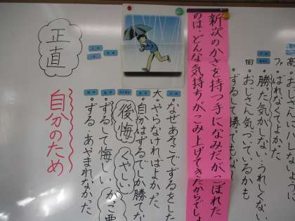 今日の道徳は,「新次のしょうぎ」という題材で,『正直はだれのため』ということを考えていきました。