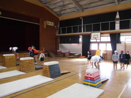 場を8つ作るために,準備はペアで1つずつとび箱を出すのでなかなか大変ですが,さすが4年生!