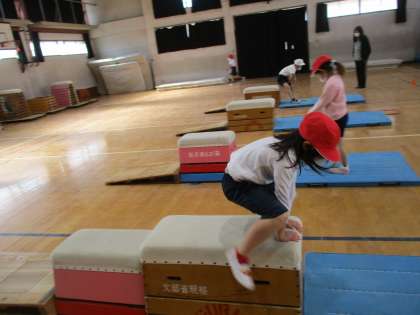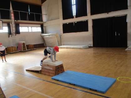 とび箱遊びでは,いろんな場に挑戦をしています。階段の場で開脚とびをしてみたり,ダーツの場で輪の中にきれいに着地してみたりと,楽しみながら進めています。どの子も少しずつ上達してきています!