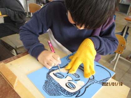 一度切りだし刀はいれているものの,やはりはみ出してしまうことがあります。そうならないように,力加減に気を付けたり,彫刻刀を動かす向きに気を付けたりして,彫り進めています。
