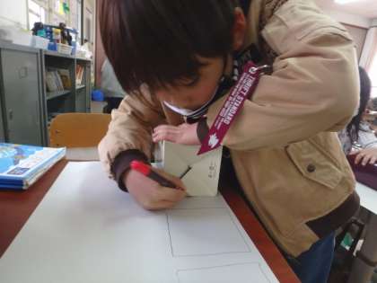 この日は箱の「面」について調べました。箱の面を紙に写してみると,正方形や長方形の面が6つあることに気付きました。