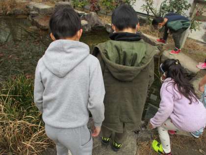 蛇口の水も冷たく,池の様子も違っていました。そのほかにも,「冷たい風が吹いている!」「木の葉っぱが全部落ちている!」など,たくさんの冬を見つけていました。