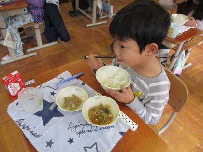 食の学習で学んだことをどの子も即実践していました!!おかずとご飯を交互に食べたり,お箸を上手に使ってお米を集めたりと,がんばっていました。