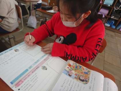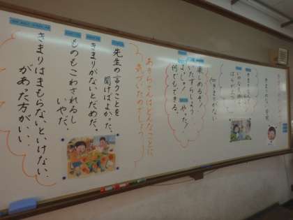 「きまりのない学校」のお話を読み,きまりの大切さについて考えました。授業の最初には,「きまりがなかったら自由に遊べる!」「宿題もしなくていいやん!」と話していた子どもたち。お話で,きまりのない学校の中で悲しい気持ちになっていくあきらくんの気持ちを考えることできまりの大切さを感じることができたようです。授業のふり返りでは,「きまりはみんなを守るために必要。」「かしこい大人になるためにきまりを守る。」という意見が出ていました。