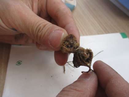 子どもが登校途中に見つけてきたカマキリの卵を山田先生が半分に切ってくださり,顕微鏡を使って観察してみました。