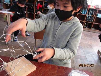 立ち上がれ!マイラインの学習をしました。針金の特性を生かして,作品を作ります。今日は設計図を描くために,実際に針金を触り,どんなものを作りたいかを考えました。とても楽しそうに活動している姿がすてきでした!