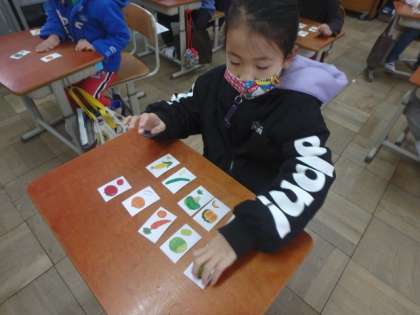 野菜の言い方について学びました。集中力ゲームでは,言われた野菜を順番通りに並べることができていました。すごい!