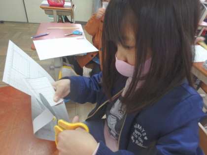 工作用紙を使って,箱の形を作りました。「教科書を見てその通り…」ではなく,問題文を読み,どのような形の面がいくつ必要なのかを話し合ってから箱を作り始めました。できた面をどのようにくっつけるのかが難しかったようですが,友達と意見を交換しながら作ることができました。