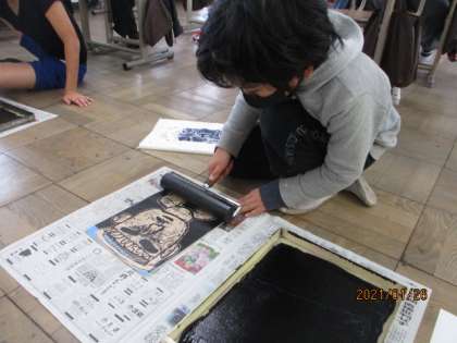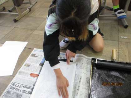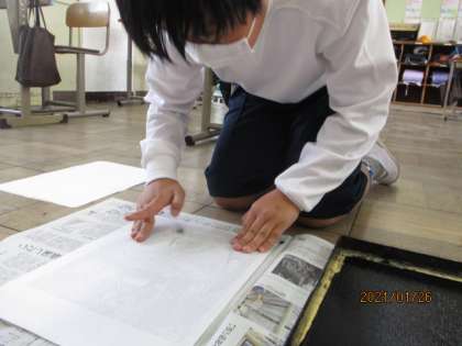 やっと刷る作業に入りました!インクを丁寧につけ,指を使って,半紙をこすり…。