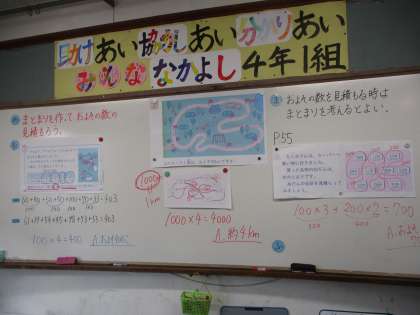 今日の算数は,およその数を求めるために,100のまとまりを作ったり1000のまとまりを作ったりして計算する方法をみんなで考えました。