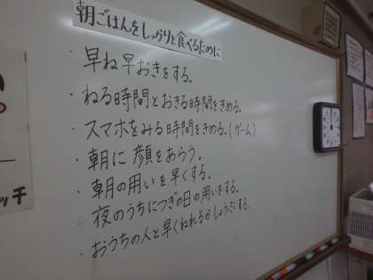 朝ごはんを食べるためにできることを考えました。「早く寝て,早く起きる」「次の日の用意を夜のうちにしておく」「起きたらすぐに顔を洗って目を覚ます」など,たくさんの意見が出ていました。朝ごはんを食べると,「体・頭・お腹のスイッチ」が入るそうです。一日を元気に過ごすためにも,しっかりと朝ごはんを食べてほしいと思います。