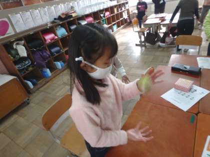 この学習ではいくつかの「わらべうた」を聴いたり歌ったりします。この日は「あんたがたどこさ」のわらべうたを聴きました。このわらべうたを知っている子も多かったようです。曲に出てくる「さ」に合わせて体を動かす遊びやリズムに合わせてお手玉を投げる遊びをしました。