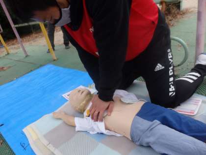 子どもが総合遊具から転落し,意識が無くなった想定で行いました。