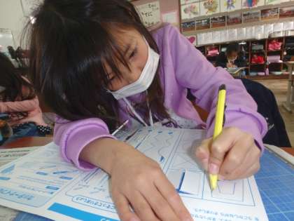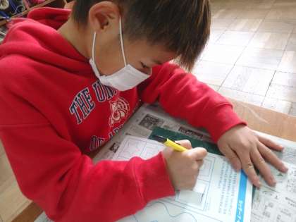 カッターナイフを使って紙を切る練習をしました。ぐねぐねとした線は,力の入れ具合が難しかったようです。