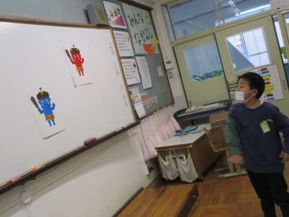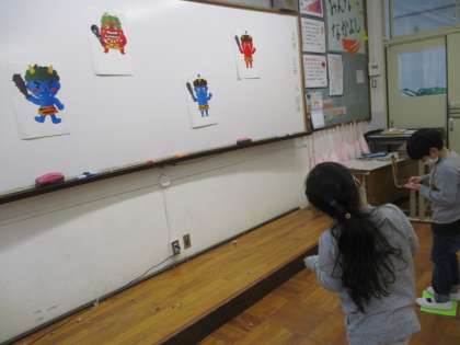 節分の日だったので,豆に見立てた新聞紙の球を鬼に向かって投げました。「鬼は外!福は内!」と言いながら,楽しみました。みんなに福がきますように!!