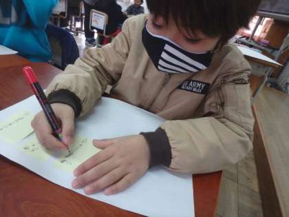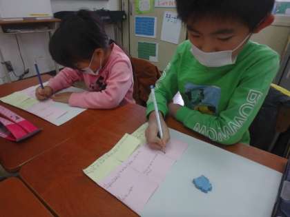 2年生での思い出を「自分がしたこと」「思ったこと」「友達がしたこと・言ったこと」の3つに分け,付箋に書き出しました。それぞれ,時間を区切りながら書いたのですが,どの子もたくさん書くことができていました。