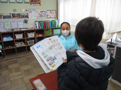 学校のいろいろな教室の言い方にも慣れ,今日は友達とインタビューゲームをおこないました。