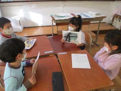 「たぬきの糸車」の学習のまとめとして,自分のお気に入りの場面の紙芝居を作り,気持ちを込めて音読しました。オリジナルの紙芝居となるように,紙芝居には登場人物の気持ちも一言添えました。