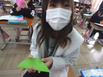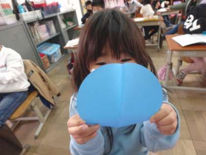 「どのようにすれば『半分』といえるのか」をグループのみんなで考えました。どのような切り方をしても,切った2つの形がぴったり重なると『半分』だといえることに気付くことができました。