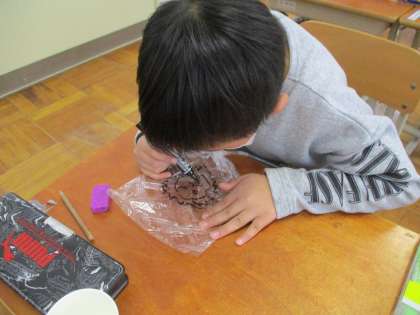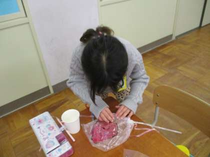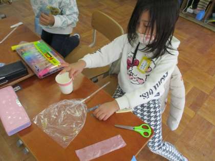 図工で「にょきにょき とびだせ」の学習を行いました。ストローを吹くと袋がふくれあがり,紙コップから出てくるという仕組みです。ペンやテープを使いながら工夫をして作りました。