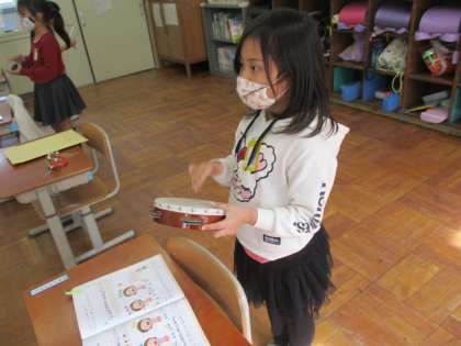 音楽に合わせて,さまざまな楽器を使ってリズム打ちをしています。楽器によってリズムを変えているので,とても難しいはずなのですが,ばっちりリズムを打つことができました。