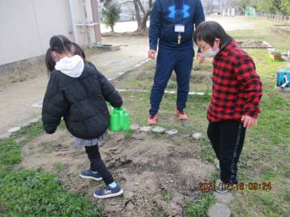 手に載せて近くで眺めたり,踏んでみて「ジャリッ」という音や感触を確かめたりして楽しんでいました。