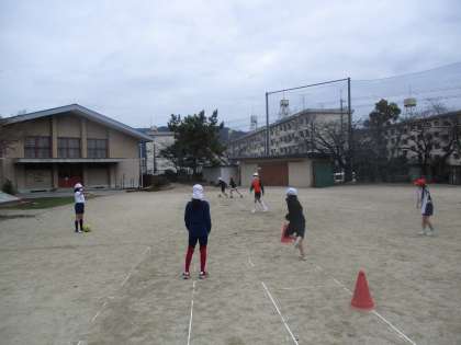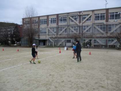 4人組でパスを回したり,おにを決めて取られないようにパスをつないだりと,いろいろな練習をしながら,上手にボールを扱えるようになってきています。