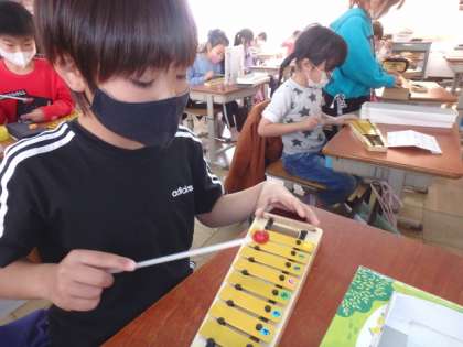 教室には,鉄琴の美しい音色が響いていました。どの子も,音の上がり下がりに注目しながら,上手に演奏することができていました。