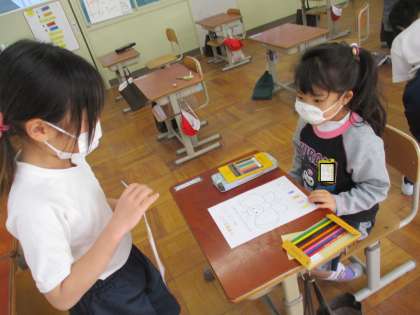 自分だけのオリジナルちょうちょを作るために,様々な色のシールや色鉛筆の材料を集めました。お店屋さん・お客さんに分かれて,英語でほしい色を伝えたり,英語で返答をしたりしました。ジェスチャーなどをすることもできており,英語でのコミュニケーションもばっちりでした。