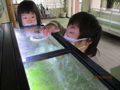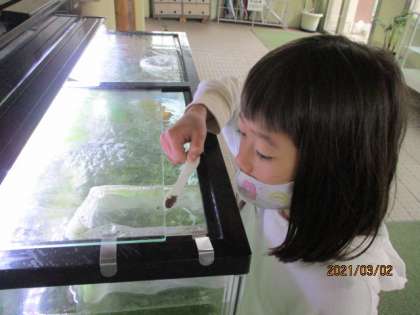 最近は,メダカとエビが卵を付けていたり,卵からかえった稚魚がいたりして,それらを探すのも楽しみの一つ♪見つけると「いた〜!!」と大きな声で報告してくれます。
