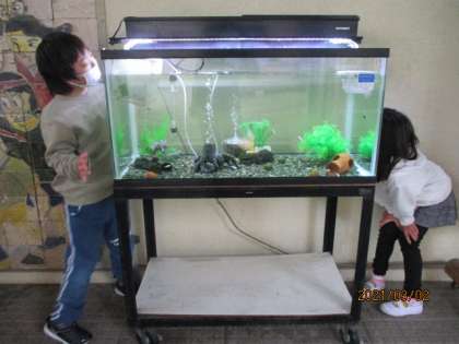 「おはよう!」と声をかけた後,えさをあげるのもあゆみ学級に任された大切なお仕事!任務を果たした後はじっくりと水槽の中の様子を観察しています。