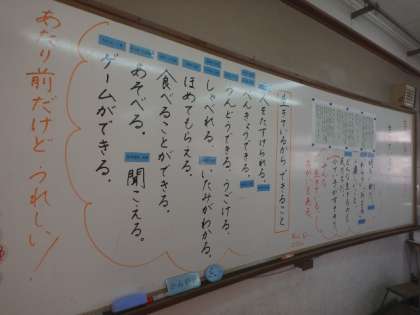 道徳の学習でやなせたかしさんの「手のひらを太陽に」の曲を聴き,「生きること」について考えました。子どもたちからは「生きているから楽しいことができる。」「当たり前って嬉しいことやな!」という意見が出ました。学習の最後に考えた「これからやってみたいこと」も,子どもたちの自由な発想で様々なことを考えることができていました。とても面白かったです!