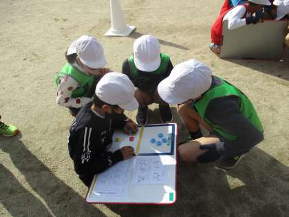 作戦ボードを使ってそれぞれのチームでポジションや作戦を考え,チームで声をかけあいながらいい雰囲気で試合をすすめることが出来ました。
