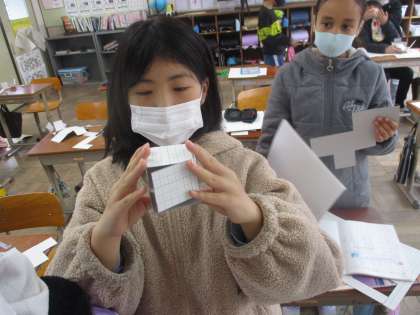 そして,他にもないかなとみんなで考えていき,全部で11種類の展開図をかけることをしった子ども達は,いろいろな展開図をかいて,組み立てて確かめてみました。