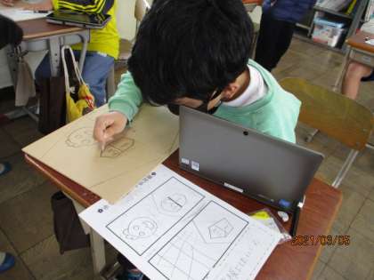 図画工作科では伝言板作成に取り掛かりました。板にイラストを描き,ホワイトボードシールをどこに貼るのか考えました。完成が楽しみです!