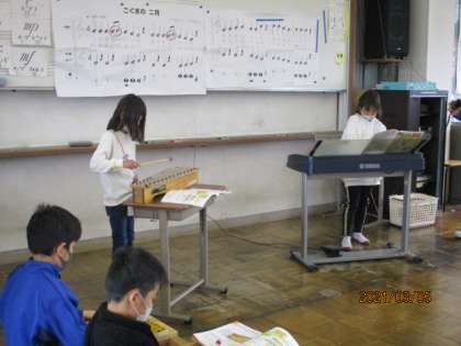 音楽の学習は,今回は音楽室で鉄琴やオルガンを使って「こぐまの2月」の演奏会。