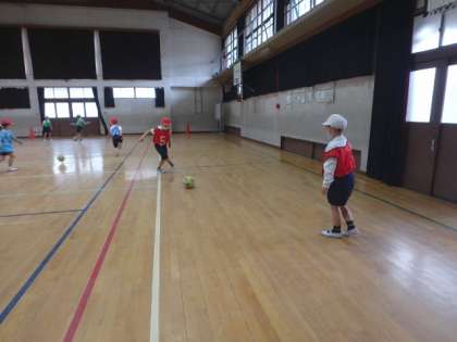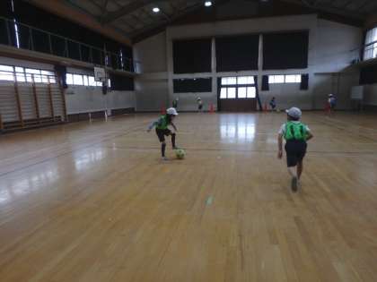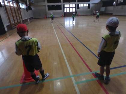 この日も生憎の雨。体育館でパスの練習をしました。前に進みながらのパス練習でも,正確にパスをすることができていました。
