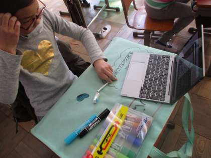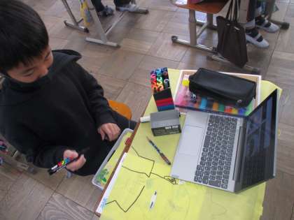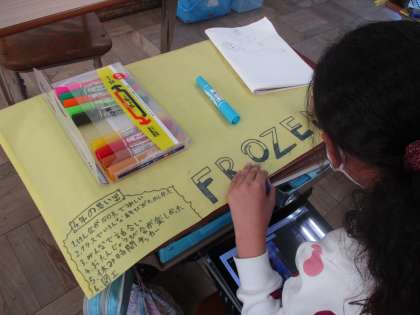 4年生の思い出を書き,あまったスペースはタブレットを使って自分の好きなキャラクターを調べて描いていました。