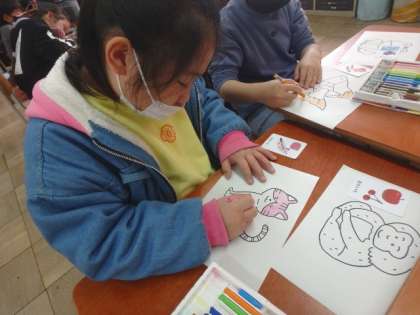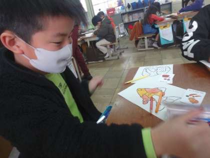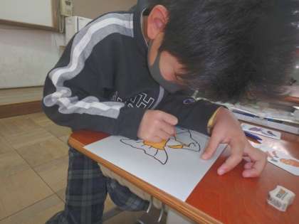 この日はグループごとに自分が担当する動物と色を決め,絵本づくりを行いました。子どもたちはずいぶん「色」や「動物」の言い方にも慣れてきました。次の時間にも,発表に向けての準備を進めていきます。