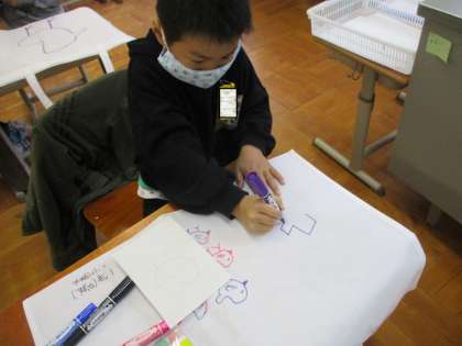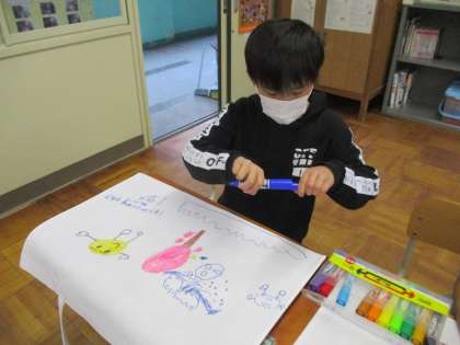 作品バックに絵を描きました。子ども達は,夢中になって好きな絵を描いていました。