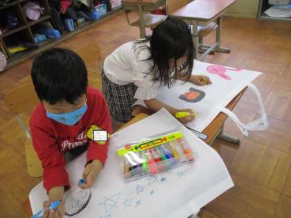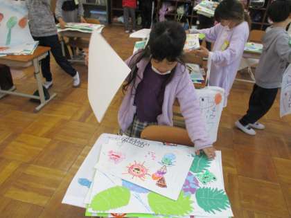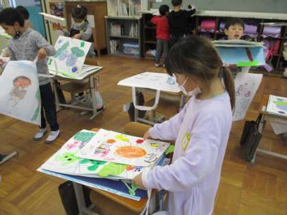 作品バックが完成してからは,この1年間の図工で作った作品を作品袋に入れました。過去の作品を見て,「こんなん描いたな〜!」と懐かしんでいました。