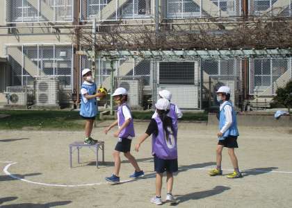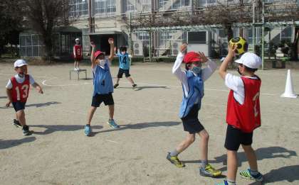 体育では, 以前に学習したエンドボールからゴールの形のみを変えたポートボールに挑戦しています。