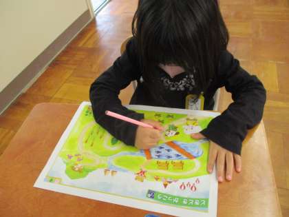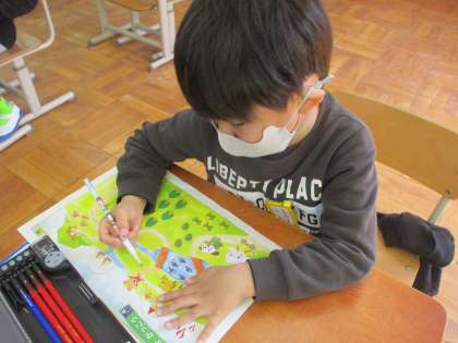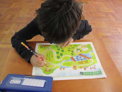 はじめての算数では,「おなじ仲間を見つけて,〇でかこもう!」ということをめあてに学習を進めました。