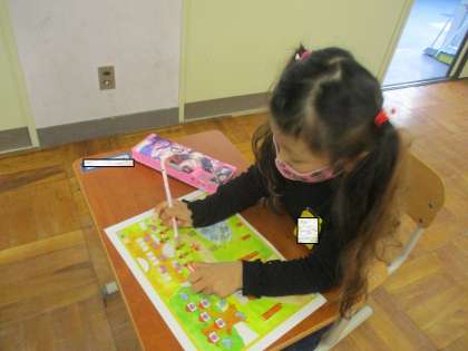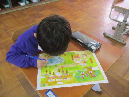 算数の学習で,「小鳥は,みんなお家に入れるかな?」ということを調べるために,小鳥とお家に線をひきました。全部に線が引けたら2つの数は同じ。余りがでたら,そっちの方が数が多い。ということが分かりました。