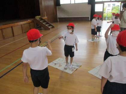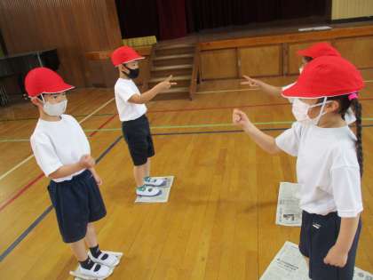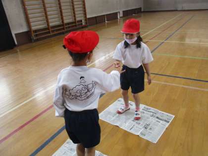 体育で「体ほぐしの運動」をしました。今日は,新聞紙を使った体ほぐしです。まずは,新聞紙じゃんけんをしました。じゃんけんをして負けた人は,新聞紙を折っていきます。どちらが先に新聞紙から出てしまうか勝負です!!
