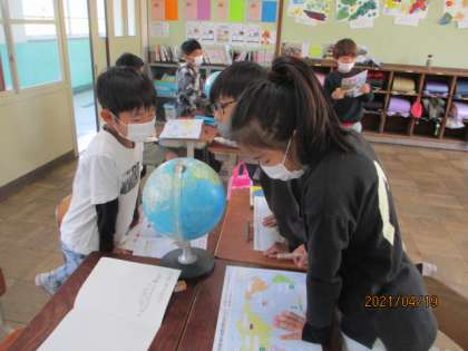 社会では,地球儀を使っていろいろな国の位置や大陸の名前をグループごとに調べました。