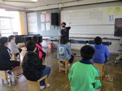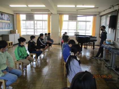 6年生になって初めての音楽の学習。今年度は齋藤先生に教えていただきます。自己紹介カードを書いたり,音符の学習をしたりしました。