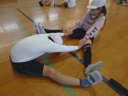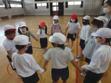 フラフープを体に通して,どちらのチームが早くくぐれるか競争をしました!