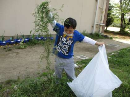 なかなか抜けない草があると「手伝って〜!」と呼びかけ,「大きなかぶ」さながらに「うんとこしょ!どっこいしょ!!」と掛け声をかけながら力を合わせて引き抜いていました。