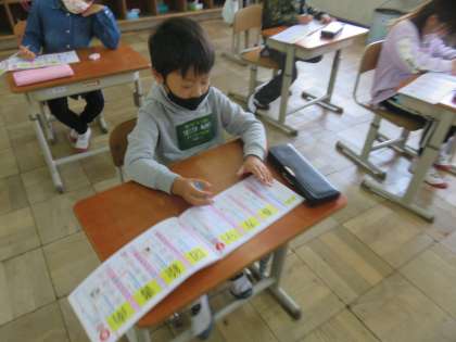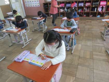 方は画数が少ない中で、春は画数の多い中で双方バランスの難しい漢字で、子ども達は何度も直しながら書いていました。
